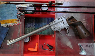 A little pistol, probably a Smith and Wesson that dad brought back from India after WWII. It was missing for most of my life and found when my paternal grandmother died. .22 cal. Single shot. Dad, who was a kid at the time, filed the trigger down so that its VERY light. Unsafe. I shot it a couple of times but it needs work. Falls open when fired.